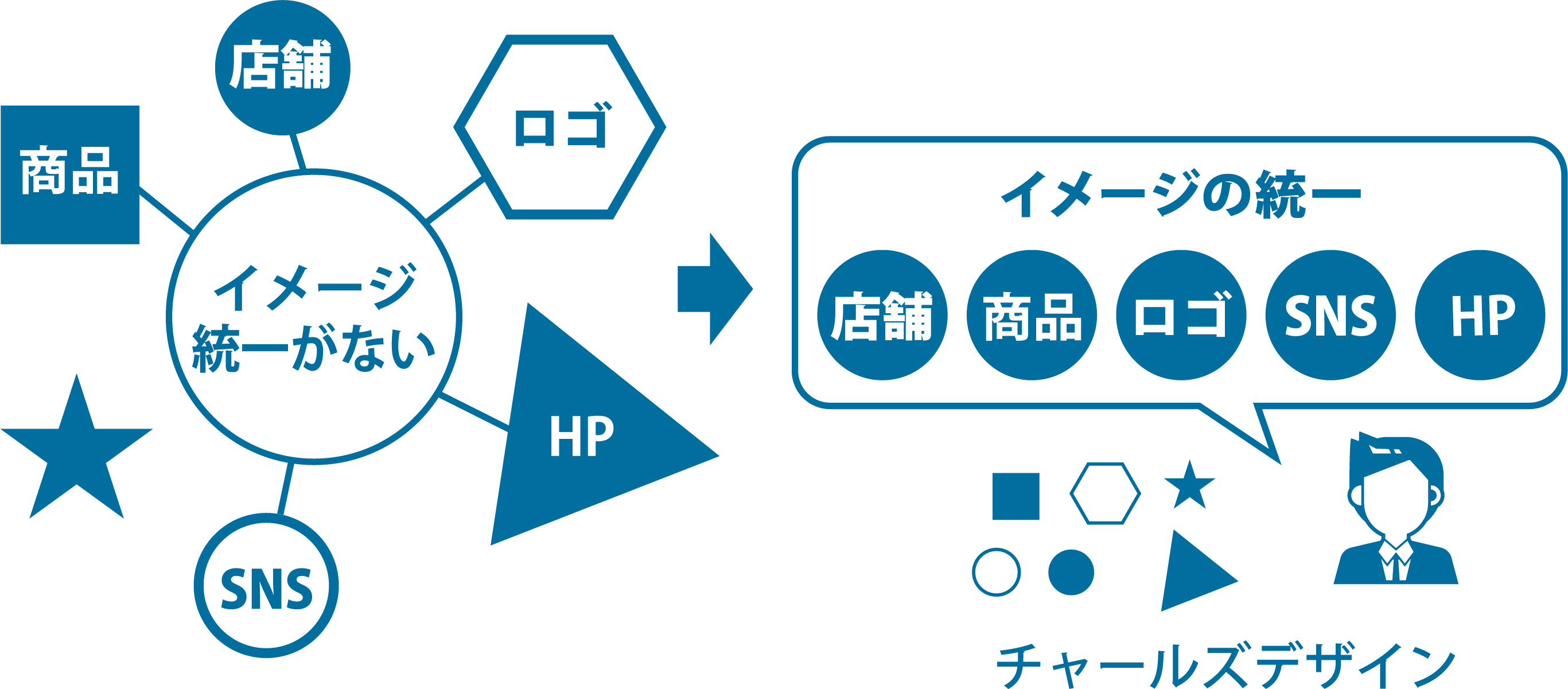 店舗、Web、印刷など、あらゆる場面で統一感のあるデザインを提供します。さらにワンストップのスムーズな進行とコスト削減を実現します。