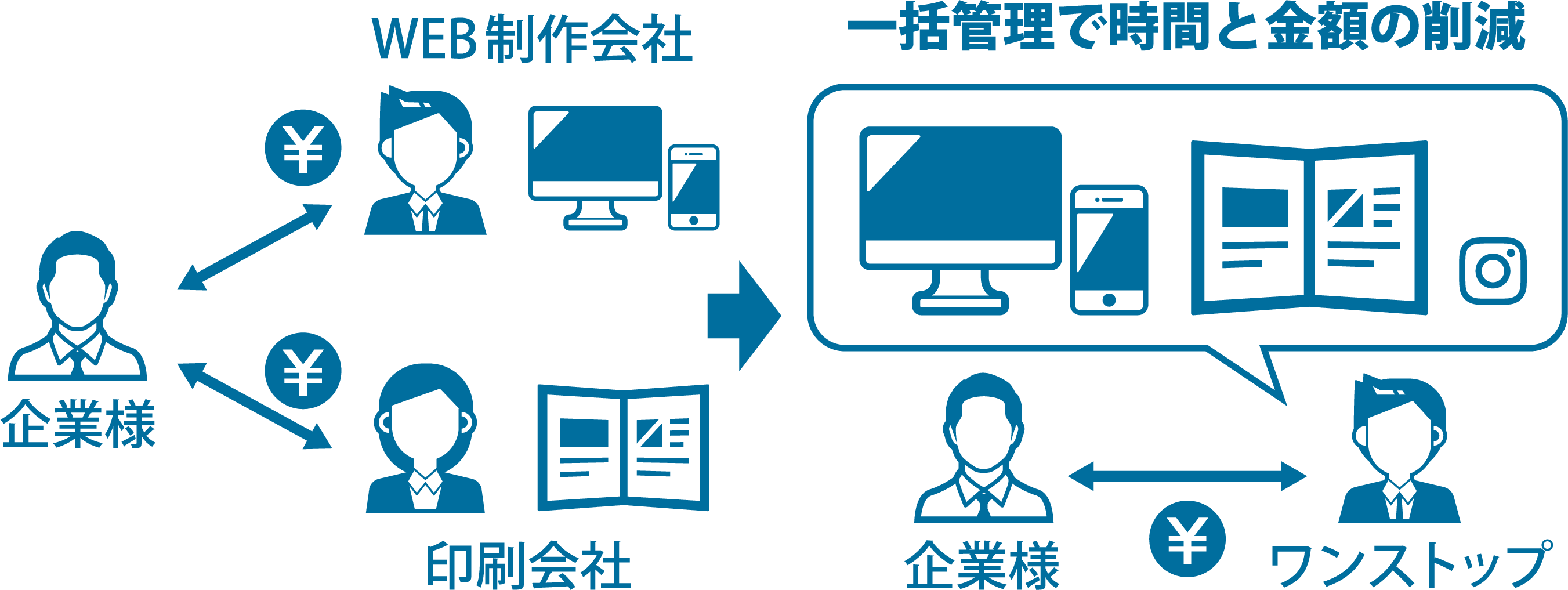 例えばWEB制作会社と印刷会社が異なる場合、コストは大きくなります。ワンストップの場合では、印刷料金もふまえた金額をご提示できますのでコストの削減になります。