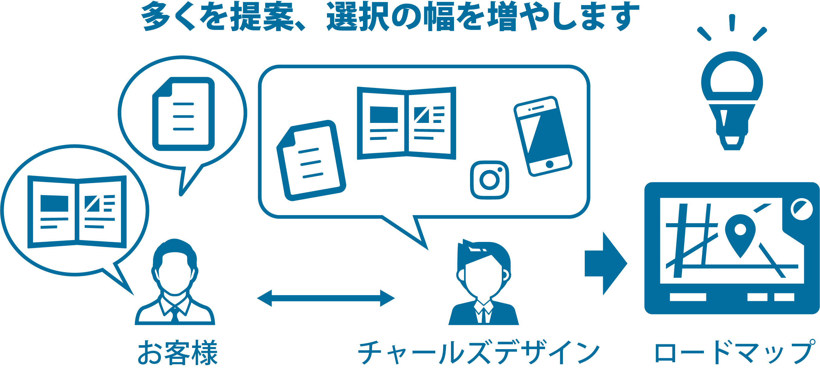 お客様の目標への挑戦を伺い、私たちは多くの可能性を提案致します。選択の幅を増やし、その挑戦を実現達成させるため、ロードマップを提案します。